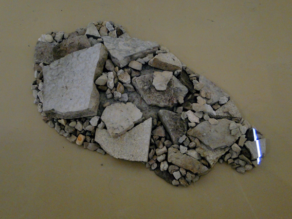 A single white line of video light moves slowly over a pile of stones and debris. It is unclear whether the pile is made from the raw materials for building, the remains of a demolition, or the product of decay. Whether pre- or post-construction, the pile represents a position near the bottom of the arc of becoming: an entropic assembly of material either to-be-composed or decomposing. Across this, the white line of light cuts a kind of index mark, a way of traversing the material’s topography in time.