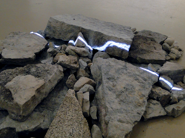 The line of light is “playing” the rough material that it glides across, like the perforated scroll of a player piano, or the long white cursor that is ubiquitous in audio software interfaces. At the same time, the line is being deformed by that material texture and form, like the undulating lines of a topographical map. This dual function remains suspended in the work: if the line is a cursor, the pile becomes a composition-in-process, while if the light forms a line of topography, the pile is its landscape, its given environment.